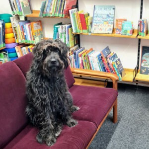 Während unserer Öffnungszeiten gibt es außerdem die Möglichkeit Rosa zu treffen. Sie ist die junge Hündin von Judith Kluthe und hofft, wenn Sie groß ist, Bibliothekshund zu werden