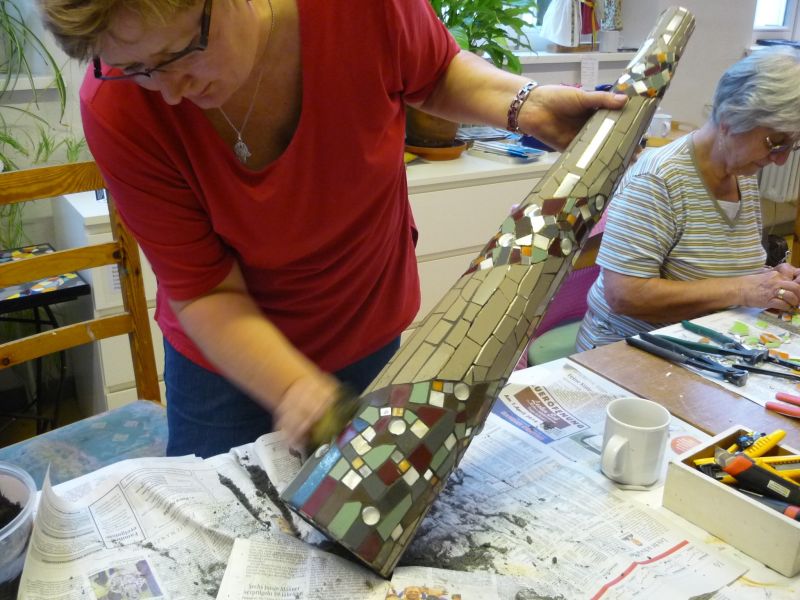 Die TeilnehmerInnen belegen einfache Gebrauchsgegenstände mit Mosaikstückchen aus Keramikfliesen, Steinen oder Glas und verwandeln sie in farbenprächtige Schmuckstücke (Spiegel, Tische, Hausnummern, Blumentöpfe, Steine u. a.). Eigene Objekte können gern mitgebracht werden. Es können auch Textilnetze beklebt werden, die zu Hause eine kahle Wand verschönern sollen. Für Anfänger gibt Ingrid Räder eine Einführung in die Mosaiktechnik. Fortgeschrittene können ihre Kenntnisse vertiefen. Die Technik ist leicht erlernbar.