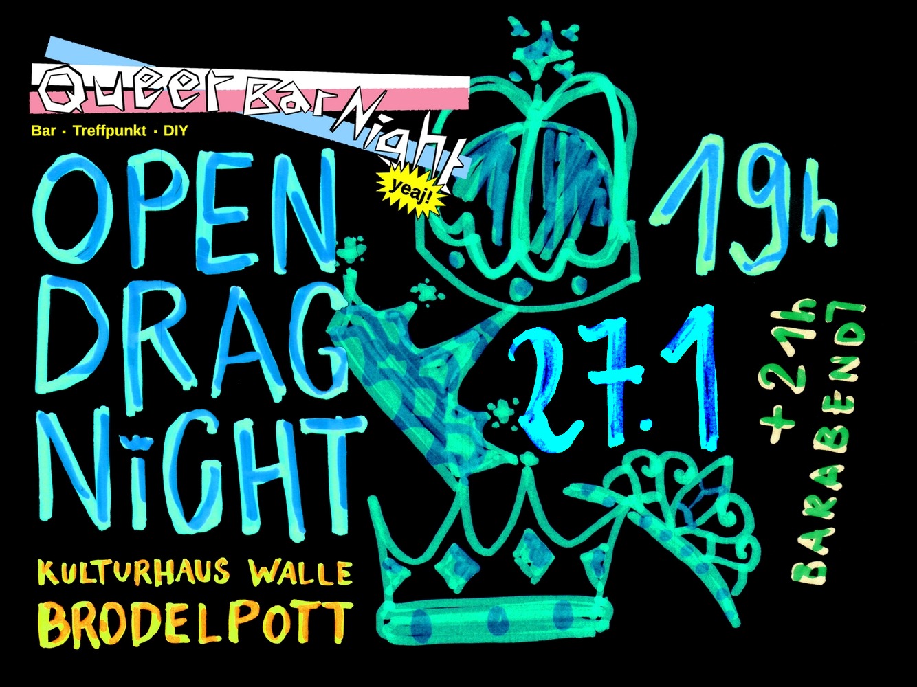 Ein Abend zum Austauschen, Ausprobieren, Teilen, gemeinsamen Schminken, die Bühne erkunden, ohne Druck, eine Show zu liefern… oder um einfach rumzuhängen. Bringt am besten eure eigenen Drag-Sachen mit, oder leiht euch Make-up von Freund*innen, und falls ihr ganz großzügig seid, bringt gern etwas mehr mit für andere zum Ausprobieren. Wenn ihr aber nichts zum Mitbringen habt, probieren wir unser Bestes mit dem was da ist.